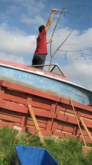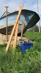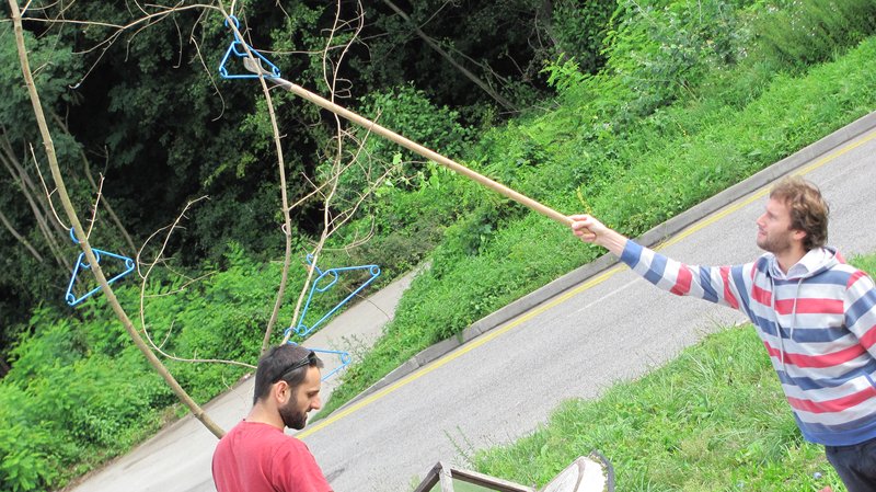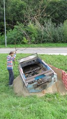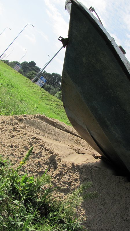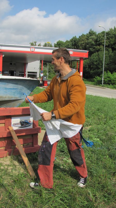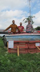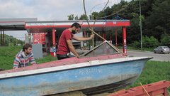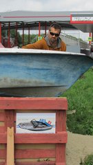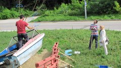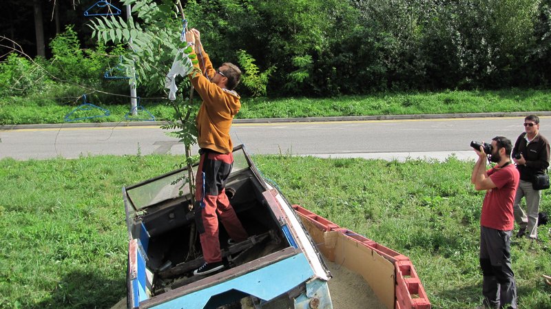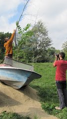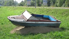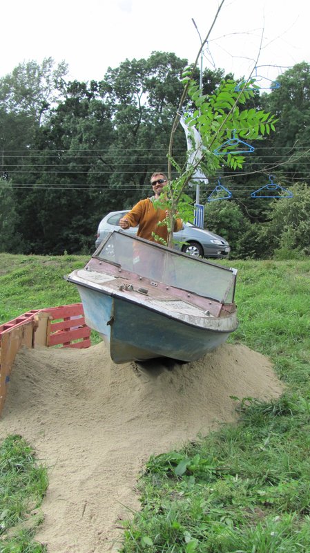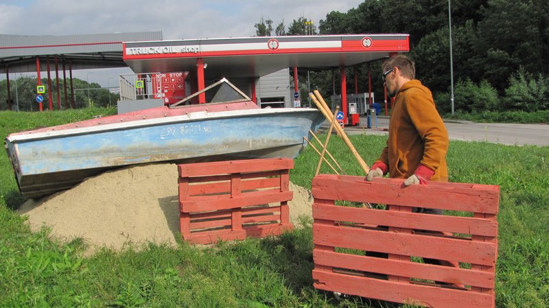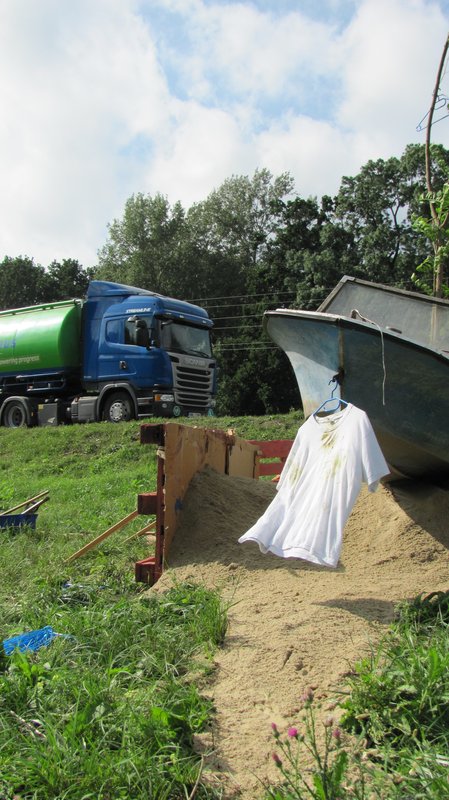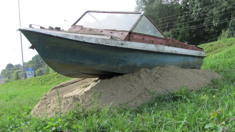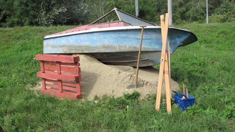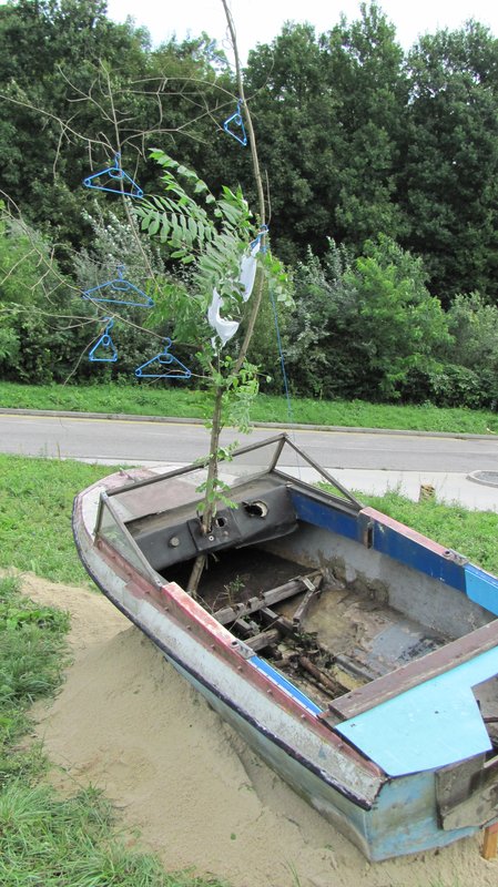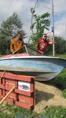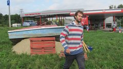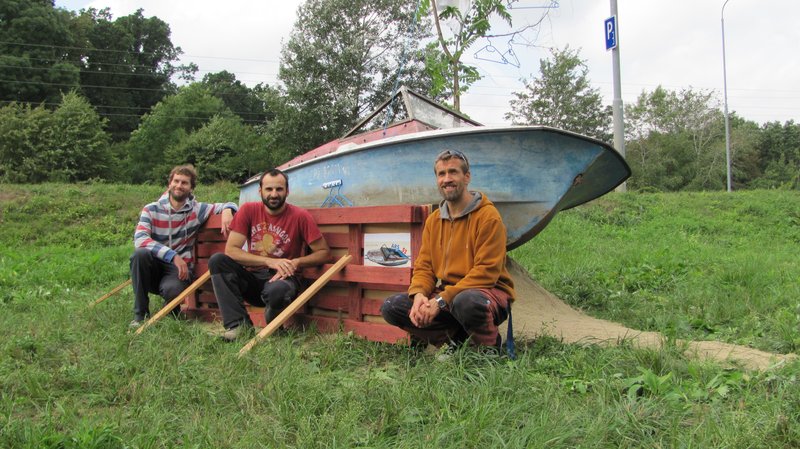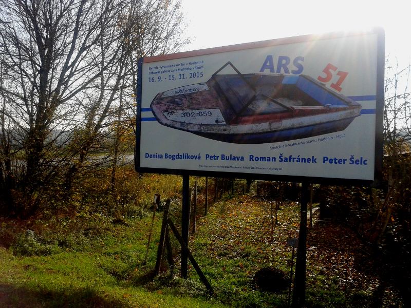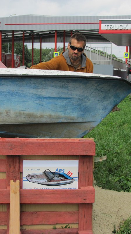 Instalace člunu Sport Pluto (bez pohonné jednotky) za účasti autorů Petra Bulavy, Romana Šafránka a Petra Šelce - 12. 9. 2015 10.00 - 12.00 na hranici ČR a SR (Hodonín - Holíč) GPS 48.8304569N, 17.1365611E